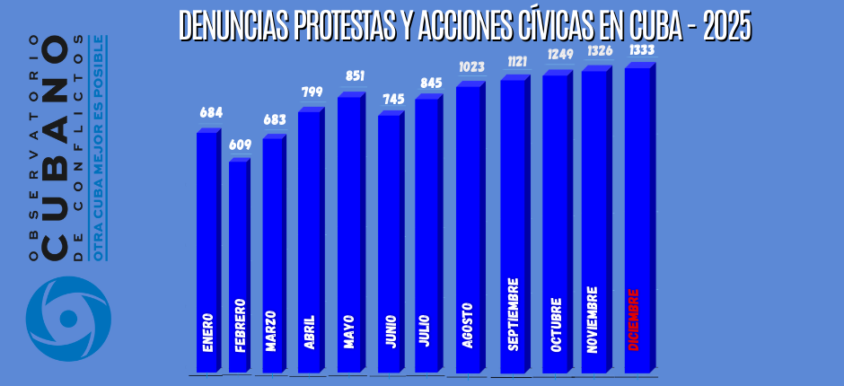 En diciembre de 2025 fue superado por quinta vez consecutiva, como indica la bitácora del OCC, el récord histórico mensual de protestas, denuncias y acciones cívicas en Cuba con 1.333, siete más que las 1.326 de noviembre.